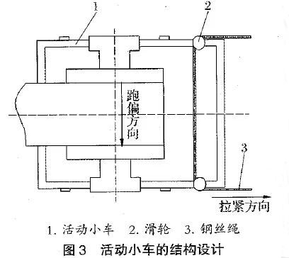 如果是整个输送机的中心线发生偏移,就要重新校正定中心线;如果只是轻微的跑偏,可以收紧紧边的轴承座。但这种方法只能调整较小的偏移量,对于大的偏移量,可以采用将机尾滚筒加装在活动小车上(见下图),通过调整小车来纠偏。