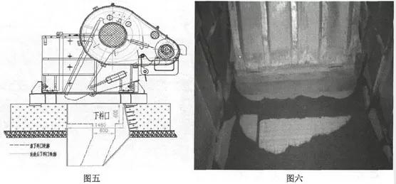 由于原设计存在一定的设计缺陷,导致下料口空间受限,漏斗积料,检修人员很难进入下料口上部以及破碎机腔体的内部进行检查。在不破坏破碎机承重基础的前提下,增大破碎机下料口尺寸,并重新设计下料漏斗,以减少物料对动颚底板下沿的冲击磨损。