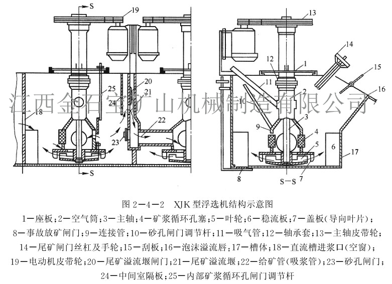 XJK浮选机每槽主要由承浆槽搅拌装置充气装置、排出矿化气泡装置、电动机等组成。(如图所示)