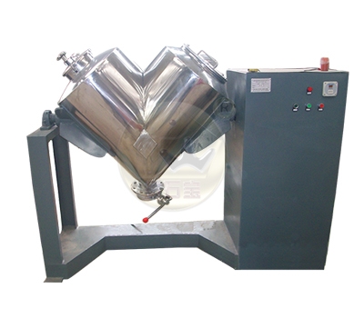 当混料筒转动时,物料在筒内从分解到组合。由于V型筒体内壁是非常复杂的曲面,使得物流的旋转轨迹无规律。加上物料在筒内运转时产生的纵向流动。这种纵横交叉复杂的流动,使物料获得了充分的混合效果。